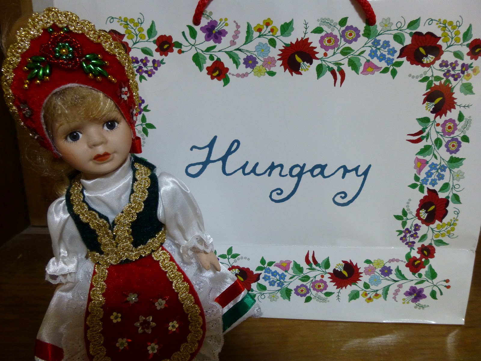 They brought me some souvenirs from Hungary. It was SO kind of them. I absolutely love them all! Here is a lovely doll wearing traditional Hugarian costume and the bag that the doll was in. It says Hungary, and I love the flower design! Their traidtional costume is so lovely! :)